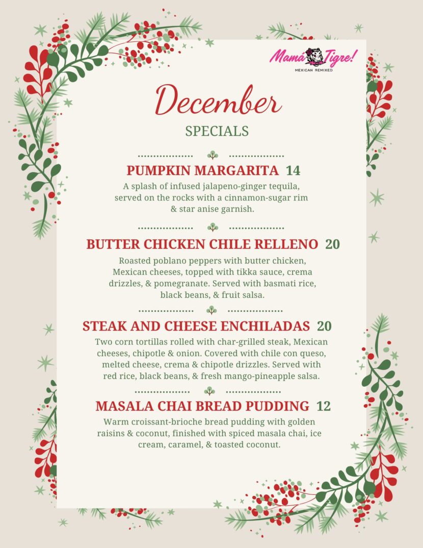 A fresh roasted poblano pepper, stuffed with corn, spinach, cheese & potatoes, topped with tikka-tomatillo sauce, queso fresco, crema & pumpkin seeds. Served with house rice and black beans.
